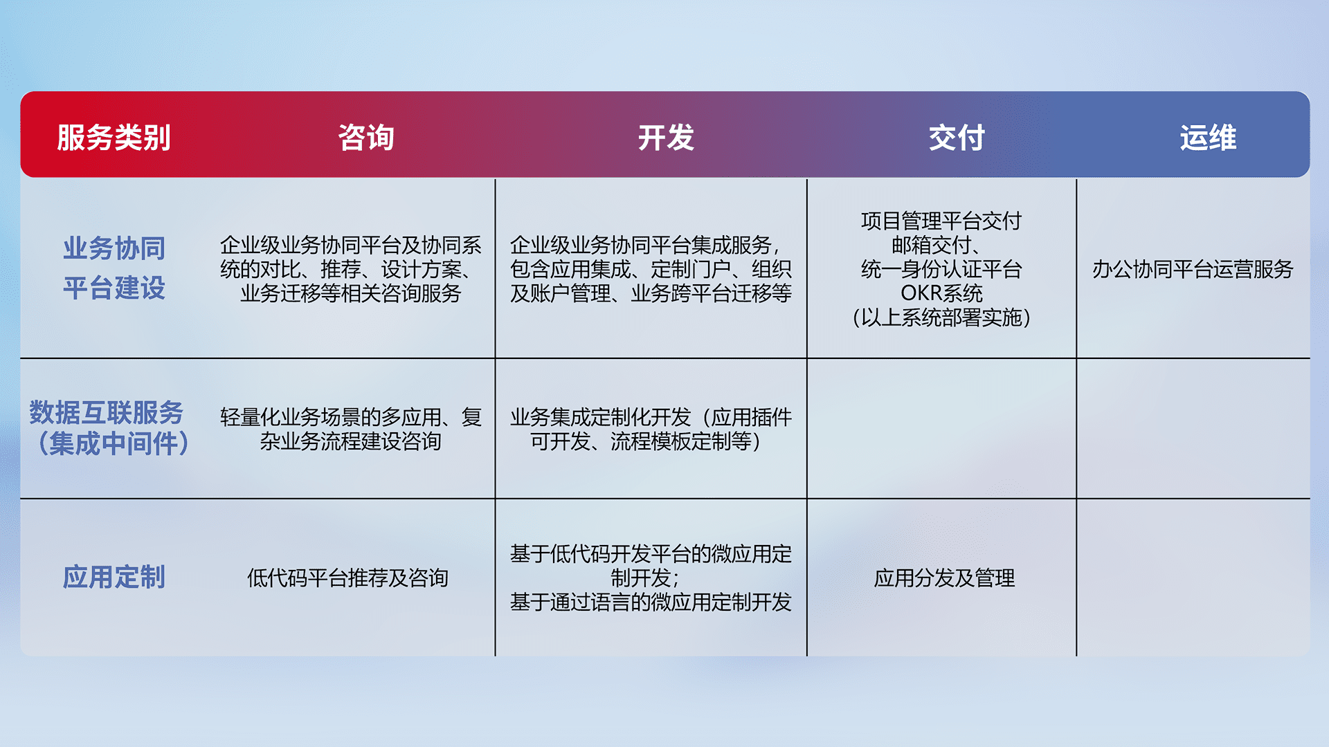 针对钉钉、、、企微、、IDaas等平台级产品提供产品的规划、、、方案、、、交付、、、、定制化开发等服务,,实现如统一协同办公、、、、智能客户服务、、、、混合会议管理、、、智能数据查询、、等业务场景,,实现数字化转型。。。。