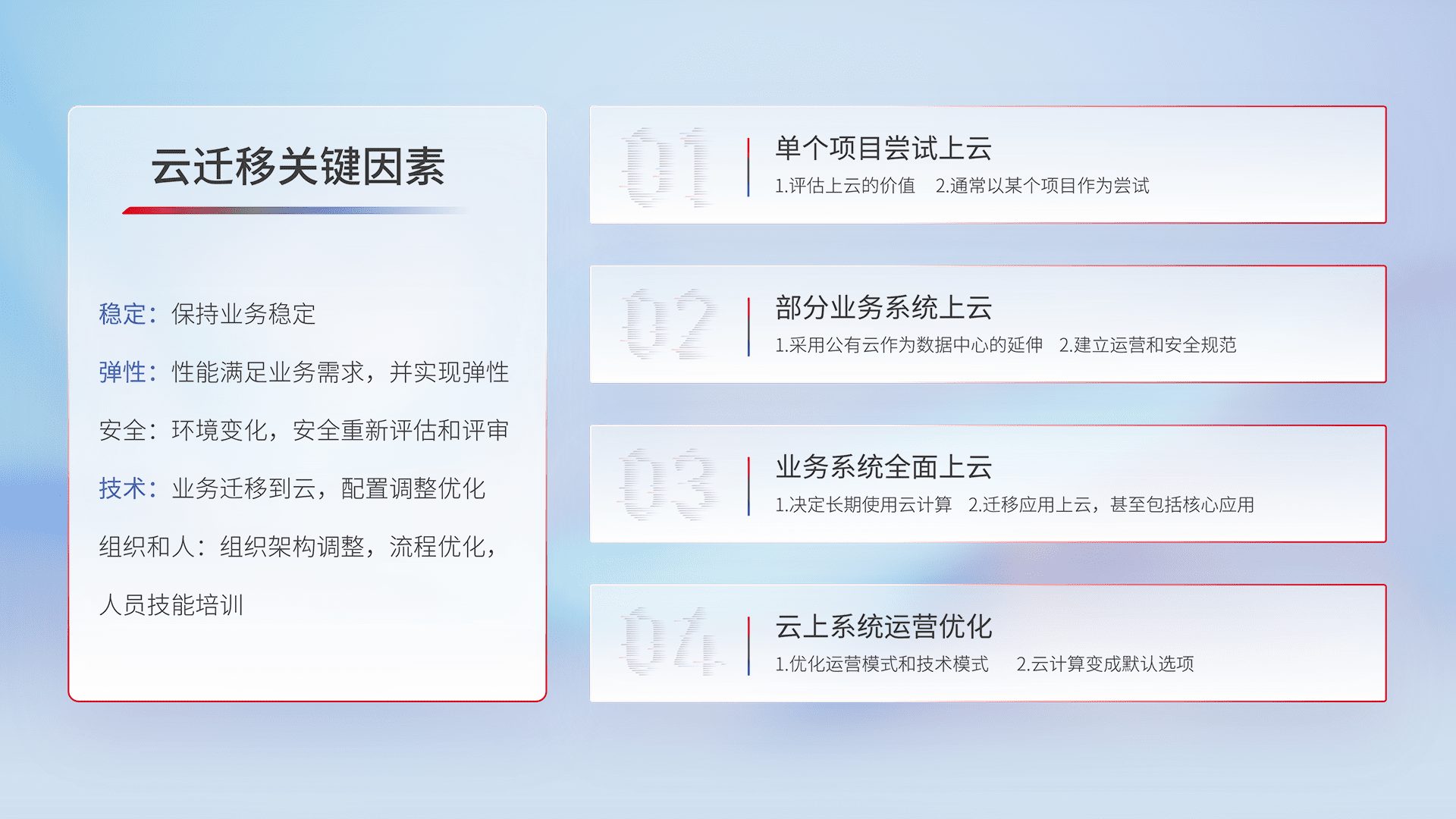 结合实际业务,,,从规划设计、、云平台选型、、、云原生改造、、、、数据迁移、、、、集成交付,,迁移全过程为客户识别最佳上云路径,,,,做好风险识别管理,,设计网络架构、、身份权限、、、安全审计合规、、、操作审计、、、日志审计、、、、监控告警策略、、、多站点容灾设计等,,,,对云上基础设施进行整体规划,,,提升IT治理水平,,,以满足弹性、、高可用、、、高性能的需求。。。。