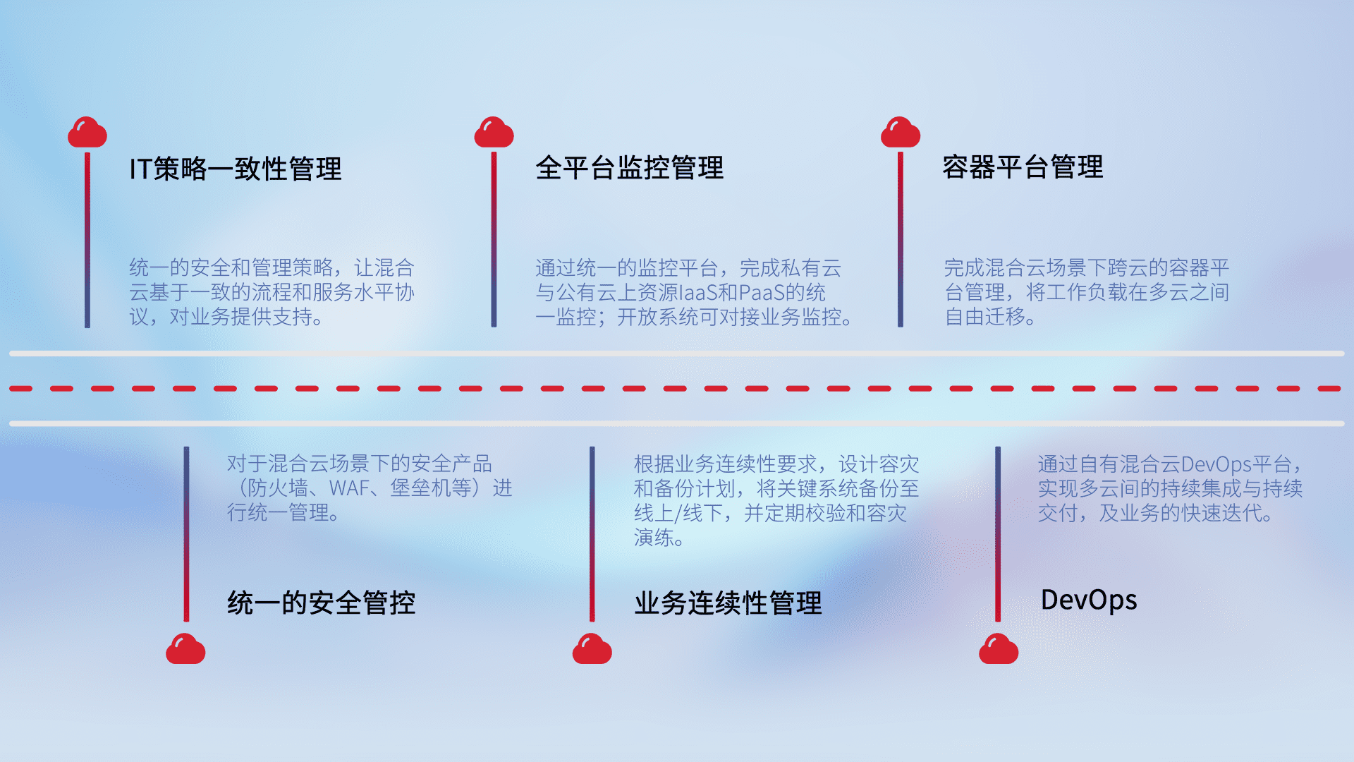 通过多云纳管,,,,以统一的资源数据模型把客户的云资源进行抽象和封装,,进而实现对多云资源的统一操作,,,保障云资源管理的可靠性、、、稳定性与可用性。。。量身定制化运维内容,,配置、、、开发运维、、、、补丁管理、、、备份、、监控、、、认证和访问管理、、、、审计和日常巡检等,,保障在用云过程中的可靠度,,稳定度以及高可用率。。。。