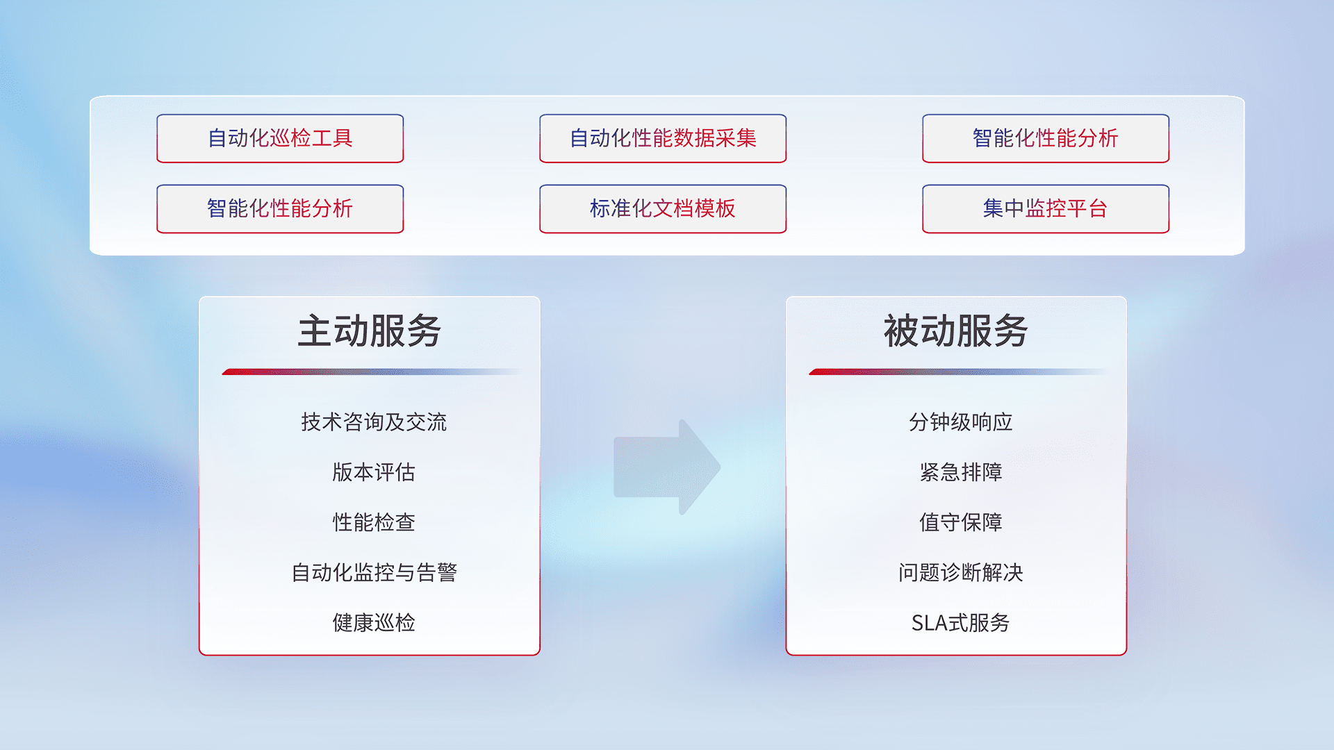 智能化工具和标准化文档,,,保障服务质量,,提供主动服务(包含技术咨询、、、版本评估、、性能检查、、、自动化监控与告警、、、健康巡检)和被动服务包含(分钟级响应、、紧急排障、、、、值守保障、、问题诊断解决、、SLA服务)。。。。